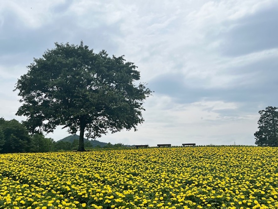ひとしきりユリのエリアを楽しんでから、さらに進んでいくと、左右の分かれ道があった。どちらが秘密の花園への道なのか分からない。そこで調べればいいものを、「まあ2分の1だし」と適当に左へ曲がるとマリーゴールドの花畑。見事に2択を外す。
