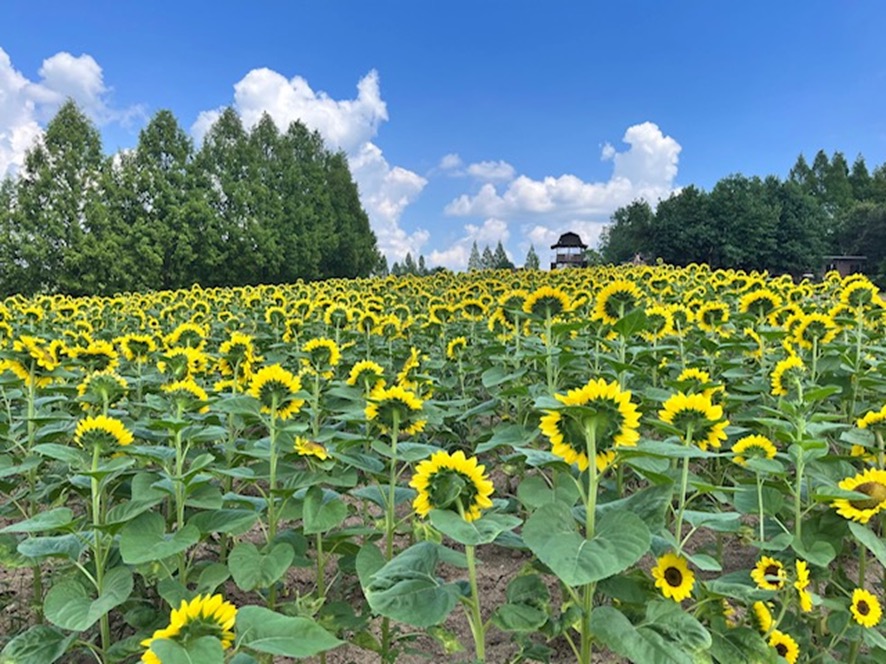 広島にて。ヒマワリ畑をこの向きから見ることはないなあ、という写真。