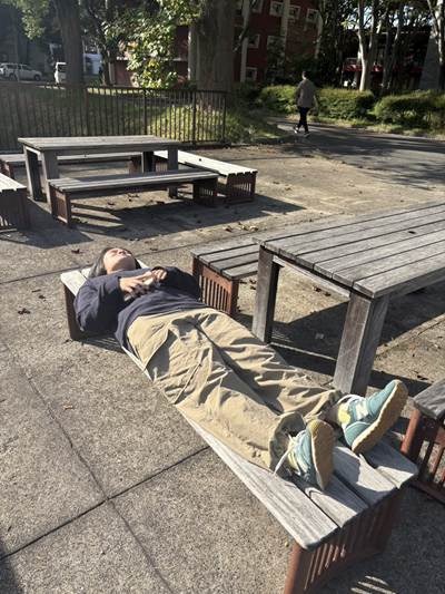 ベンチの形が曲がっているので仰向け寝は断念せざるを得ない。でも、横向きでくつろぐには最適。