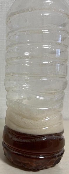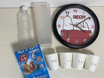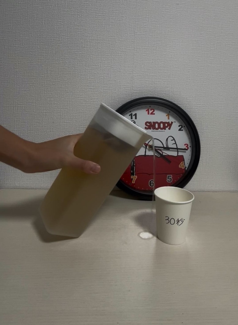 麦茶ポットに麦茶パックを入れておき、そこに沸騰したお湯を入れてお茶を作る。注ぎ終えてから30秒、1分、3分、5分、10分ごとに紙コップに茶を注ぎ、冷えてからそれぞれペットボトルに移し替え、振って泡のでき方の差を比べる。
