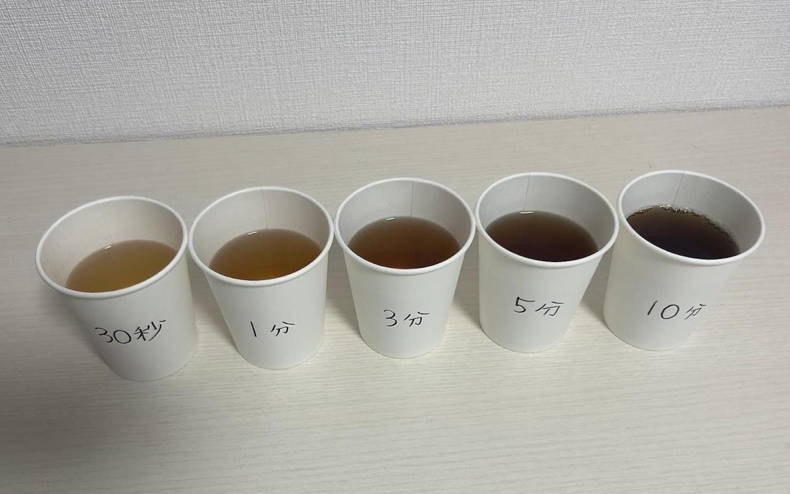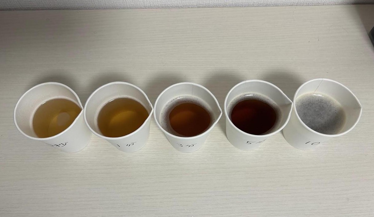 注ぎ終え、比較してみるとこんな感じ。時間が経つほどお茶が濃くなっていることが分かる。