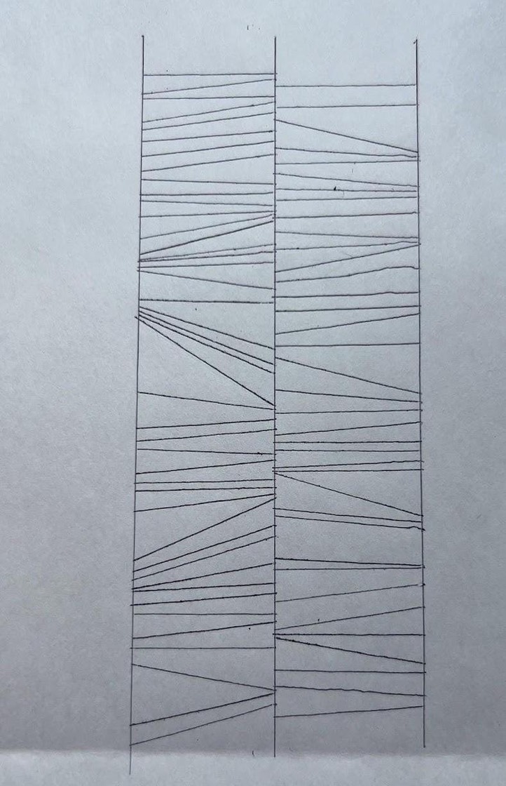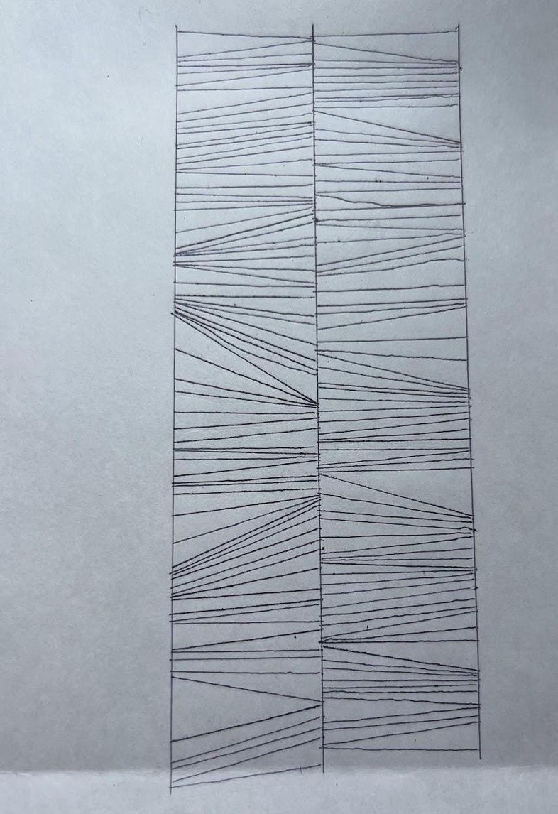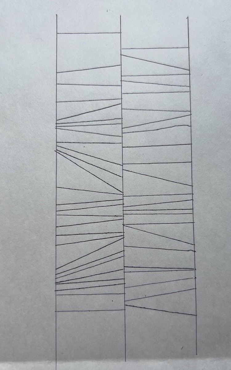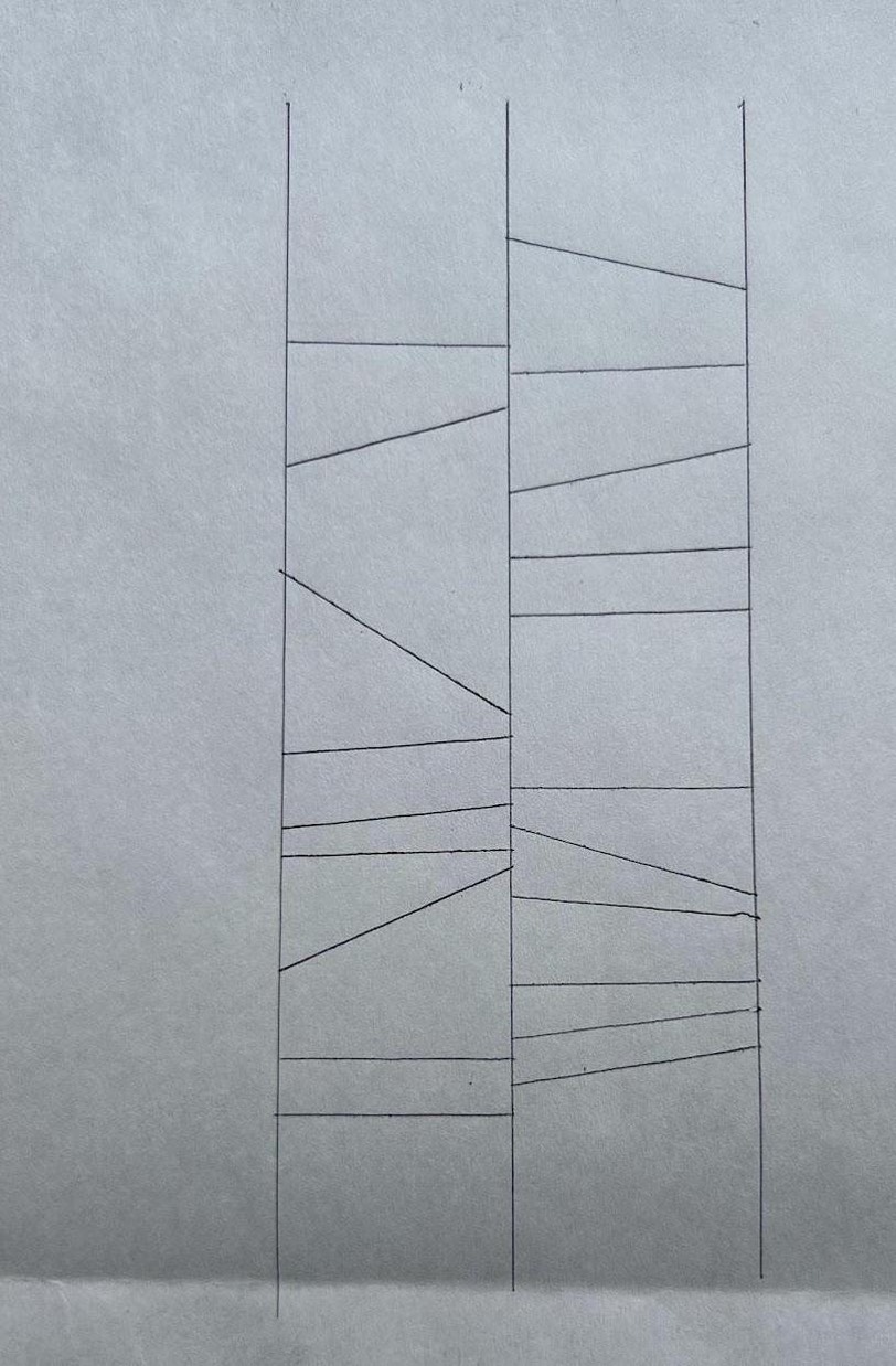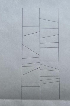 まっさらな紙に基準の線となる縦線(約20㎝)を3本引いた。どこまでいけるか分からないが目標は100本!(正直、全く予想がつかないが)