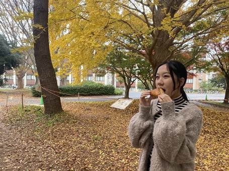 チョコパイを持っている手つきや、キメ顔の角度、ちょっとしたステップまで全部本家を研究。通りすがりの学生が思わず二度見するレベルで、秋のキャンパスに謎のCM感が漂いました。
