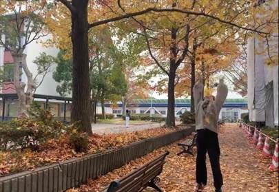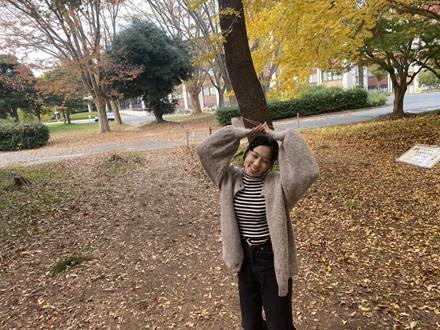 そこで思い出したのが、あのクセになる 「三角チョコパイのCMダンス」。鳥大キャンパスの紅葉がちょうど見頃で、「秋っぽいおもしろい企画したいな〜」と思っていました。そこで、せっかくなら紅葉の中で本気で再現したら絶対映えるし、何より自分がやってて面白い!ということで、「三角チョコパイのダンス」を再現してみることにしました。