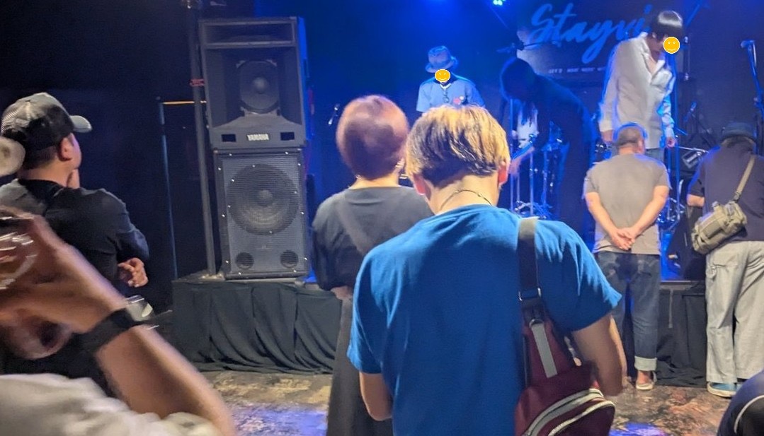 いよいよ中林さんたちのバンド「くもりのち」の出番である。事前に、中林さんたちから「顔を隠してなら、写真撮影もOK」という許可を取っていたので、スマホを構えて、準備するバンドを待っていた。