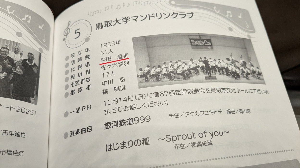 プログラムを開いてみてふと気づいたのは、ゼミ生の戸田さんが鳥取大学マンドリンクラブの代表者になっているということだった。ゼミでは、SNSの「中の人」をやっているとは聞いていたが、代表者だったとは…普段を知る教員としては、学生の意外な一面を改めて知ることになった。
