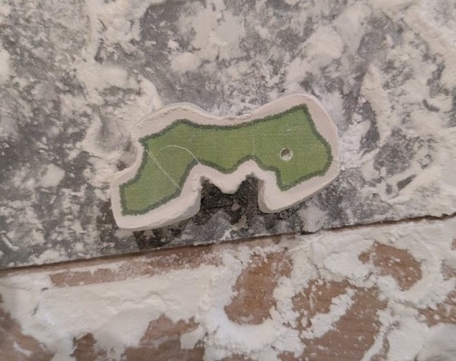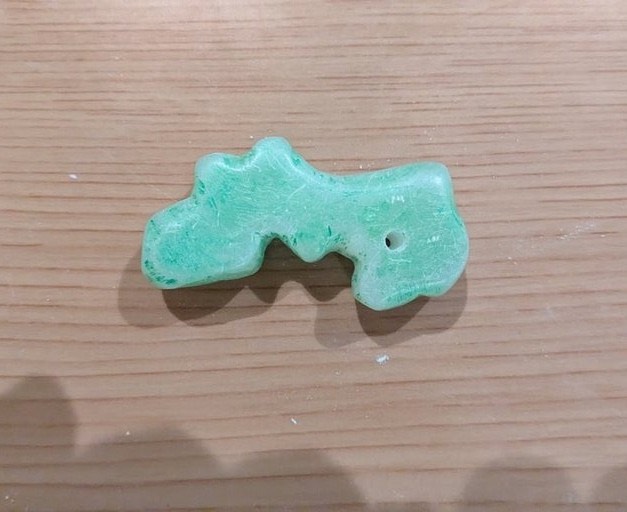 白い鳥取の完成といってよいだろう。ただし、まだ石の端の部分が滑らかになりきっておらず、勾玉らしさに欠ける出来になっている。水性マーカーで着色をしつつ、細かなヤスリと耐水ペーパーで仕上げをしていった。