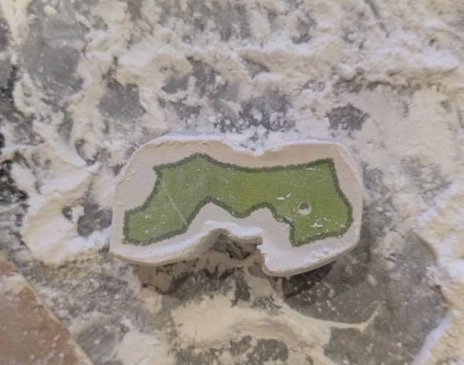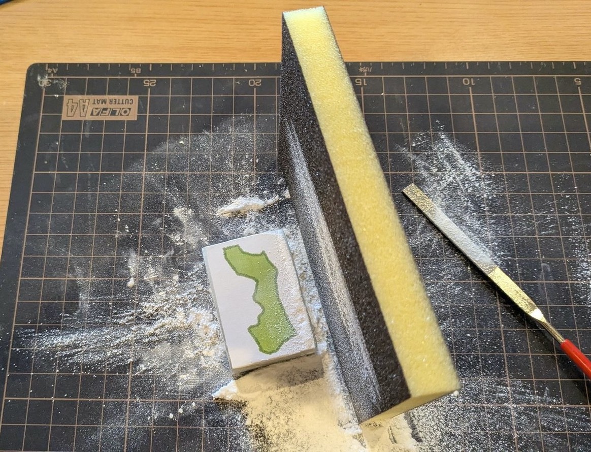 削り続けるにつれて、シールに書かれた県境と石の端が近づいてくる。さすがにこうなってくると、スポンジ型のヤスリでは削れないので、最初に使っていた小型のヤスリに持ち替えて、さらに細かく削っていった。