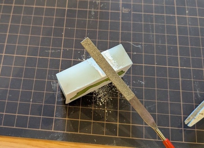 勢い込んで削っていったが、何せヤスリが小さいのでなかなか進まない。いつになったら終わるんだろうかと、開始から10分もたたずに、途方に暮れてしまった。が、大人の私には、さらに秘密兵器があった。