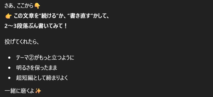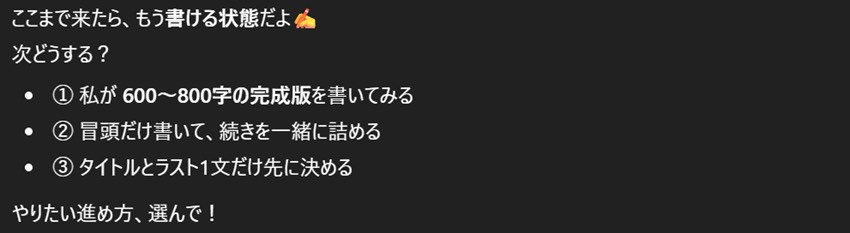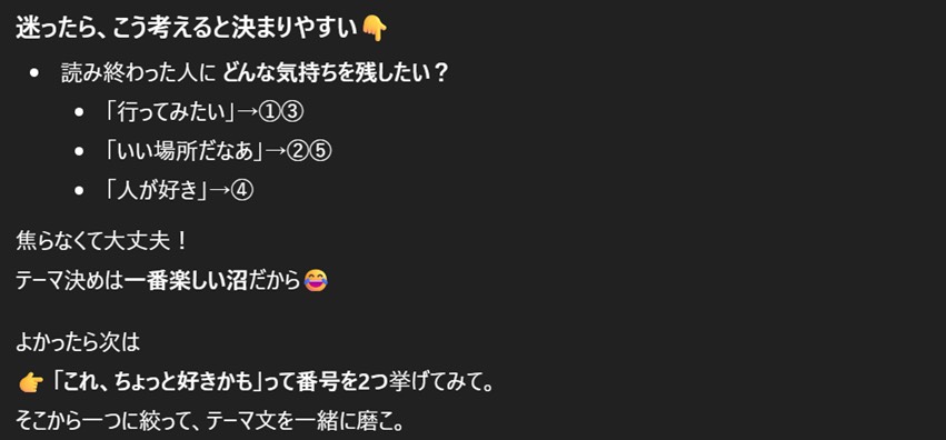 方向性は4つほど提案してくれた。この中で4つ目がとても意味不明だったが、ここではいったん保留としておこう。(※ChatGPTの具体的な回答はこれ以降全て伏せておきます。わかりにくくて申し訳ないのですが、最後の完成をお楽しみに!)