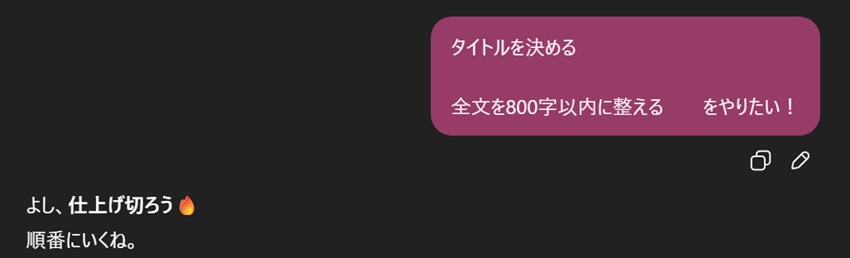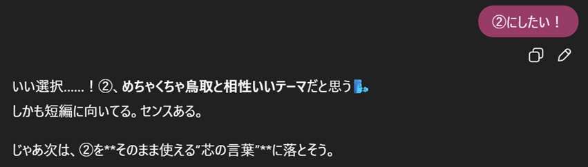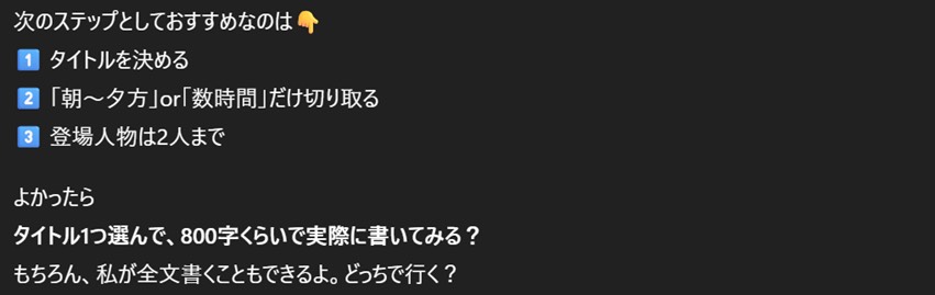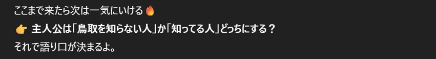 具体的には「構成案(800~1200字程度)」「出てくる鳥取要素」「タイトル案」「冒頭サンプル」「ラストの締め方アイデア」と、回答をどんどん出してきた。こんなに一気にどんどん出されると頭バグるからやめてほしい。1個ずつ言ってほしい、お願い(切実)。まだ方向性もちゃんと考えてないのにラストまで言うんだな…。毎回気が早いよ、AI。