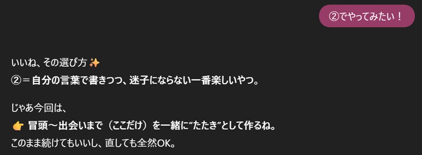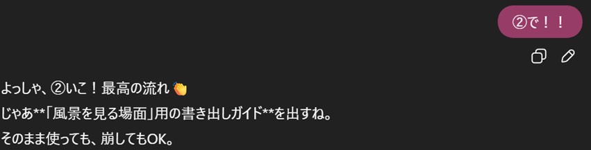 ここで、①にしたいのはやまやまだが、一旦②を選択してみたい。③のラスト一文を決めるのはなんかちょっと早い気がするので、やめておく。