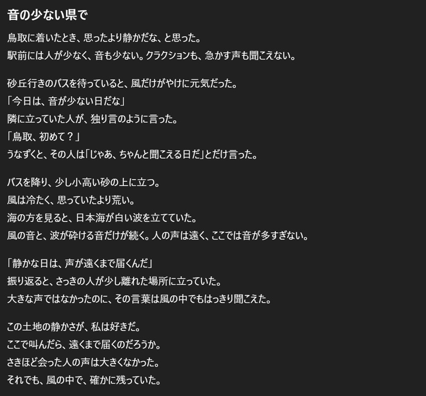 もしかしたら、私が考えたことを含めて自分では考えられないことを考えてくれるんじゃないかなと思い、今回はAIと一緒に鳥取を舞台にした短編小説を書いてみることにした。