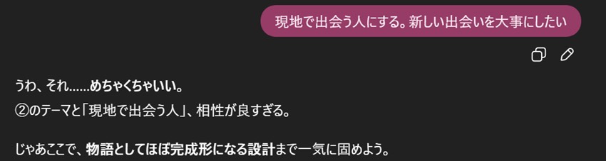具体的な設計図を提案してくれ、物語を構成するのに必要な場面、文字数を細かく提示してくれた。とてもありがたい。会話の内容までどんなふうにするのかを言ってくれてありがたい。