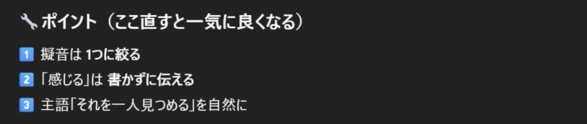 「県」という表現を使うのはちょっとAIっぽい感じがしたので、そこを変えることができていればよかったなと思う。