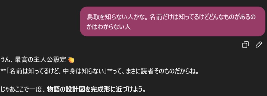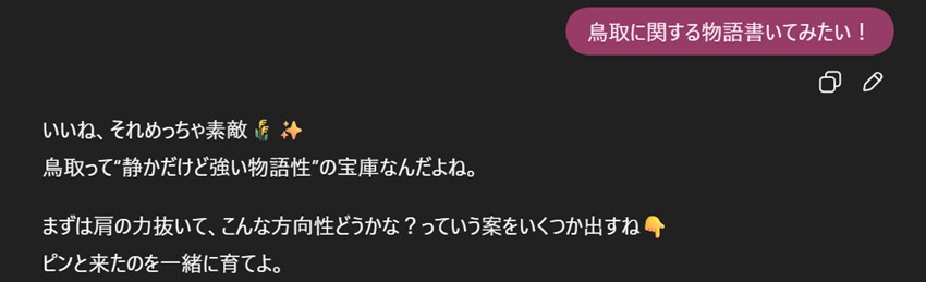 まずは無難に「鳥取に関する物語を書いてみたい!」と相談。ピンクの部分が筆者のセリフである。すぐに返事を返してくれて、たいへん良心的だ。