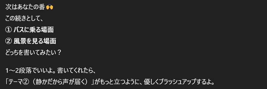 300字程度でたたき案を出してくれた。これがあれば何とか作れるだろう。そろそろ終わりに近づいてきた感じがする。ここで、私の番と言われた。2つの選択で選ぶような感じになっている。