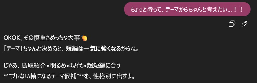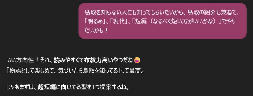 ChatGPTの言う通り、テーマは「鳥取紹介×明るめ×現代×超短編」にしよう。ここまで決まればなんか自分でも書けそうな気がするけど、今回はもっとアドバイスをもらうためにChatGPTを使いましょう。