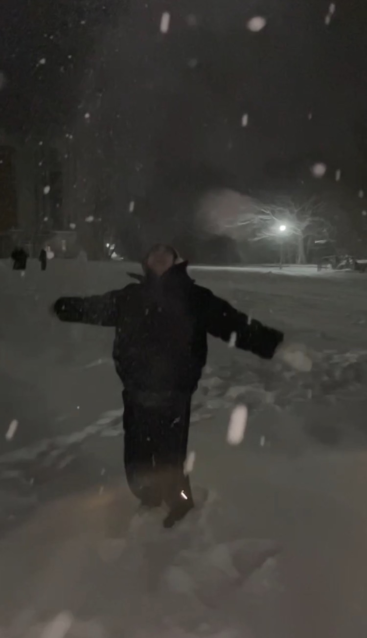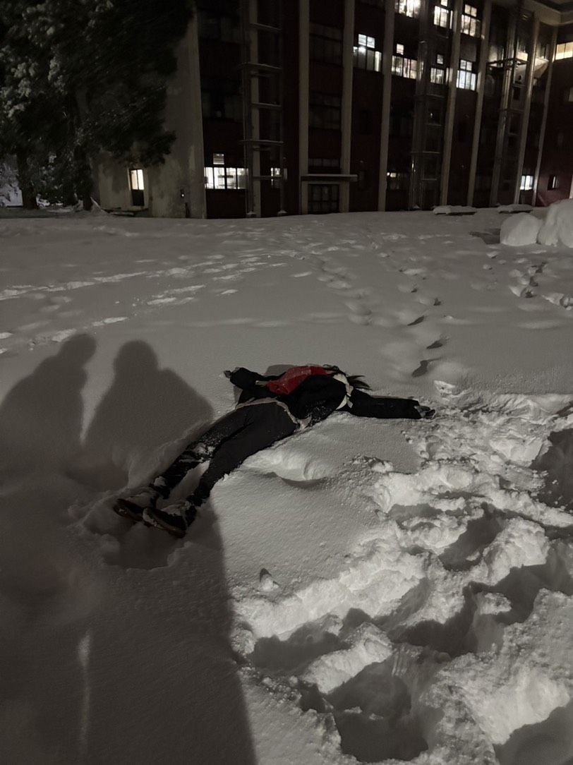 まず最初にやりたかったことは、雪の上に寝転がること。ずっと憧れていたが、いざ目の前にすると「ほんまにいける?」と一瞬ひるむ。しかし次の瞬間、勢いだけでダイブ。結果、ふっかふか。冷たいより先に「え、なにこの感覚?」が来た。人生初の雪ダイブ、控えめに言って最高でした。