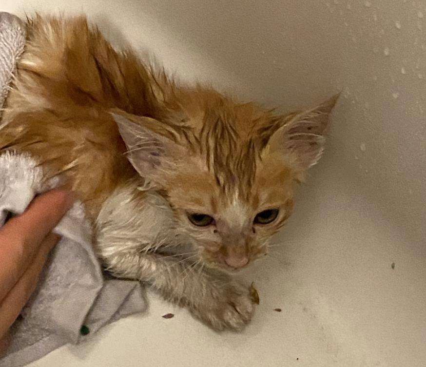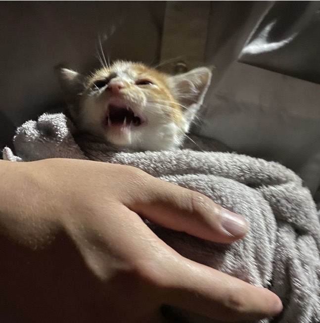 捕まえるのに1 時間、びしょびしょの攻防戦。草むらを逃げ回る子猫をタオルを持って追いかけた。そして、なんとか1 時間後、ようやく保護に成功。