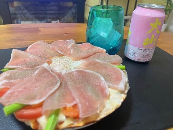 生ハムをのせて、完成。大山サクラハイボールで乾杯!