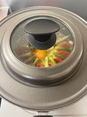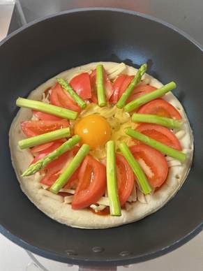鳥取県産のアスパラガスとトマトを並べて、中央に卵をオン。