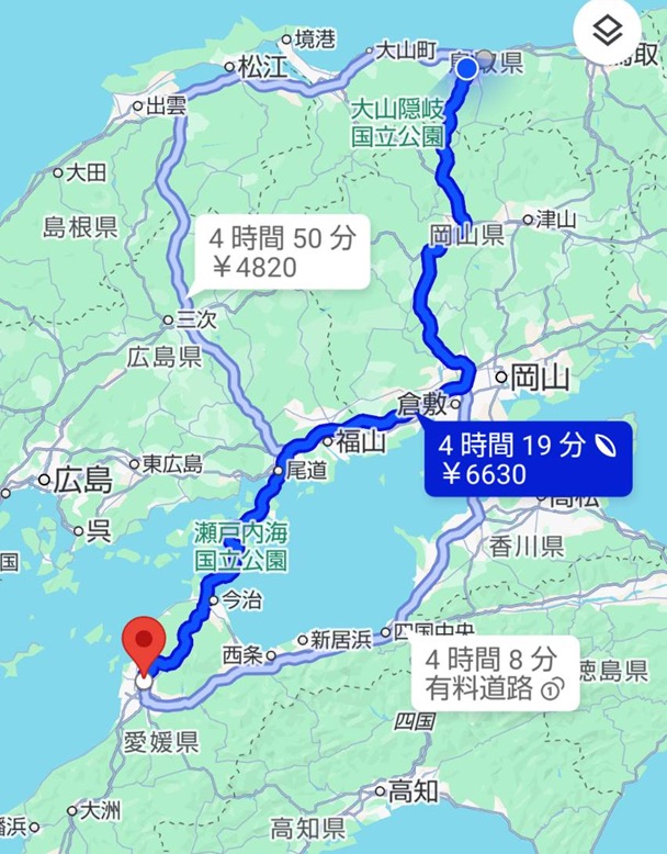 私は1限、運転手は2限の授業を終え、12時30分頃鳥取大学を出発。予定としては17時~18時の間に目的の愛媛県の旅館に着く予定だった。それまでに行ったところにより、予定外のことになるとはこの時には思ってもいなかった…。