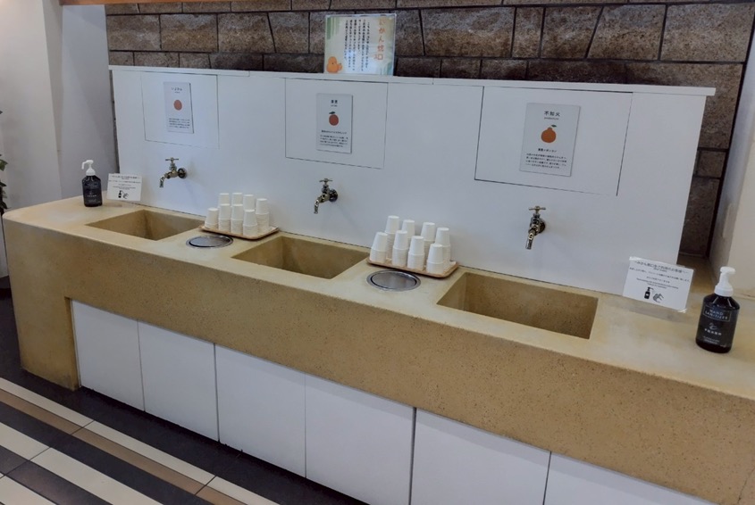 左の蛇口から、「いよかん」「清見(温州みかん×トロピタオレンジ)」「不知火(清見×ポンカン)」。私は酸味の強い「いよかん」が好みだった。