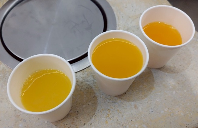 左のコップから順番に「いよかん」「清見(温州みかん×トロピタオレンジ)」「不知火(清見×ポンカン)」