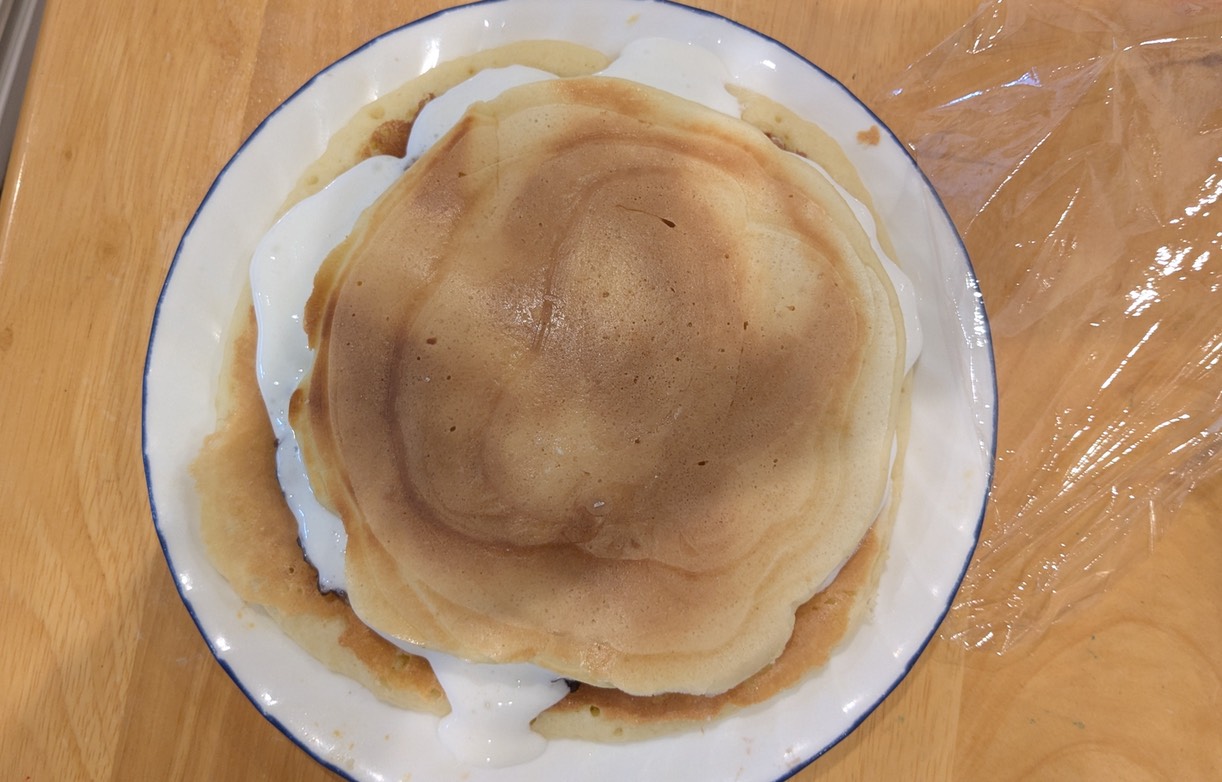 何とかそれらしいものができたのでホッとしていたら、ホットケーキを冷まさなかったので、ホイップクリームがどんどん溶けてきた。最終的にどうなるか予想がつかないが、取り敢えず大学に持っていけるようにお皿に乗せて、サランラップで保護することにした。