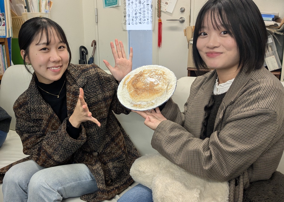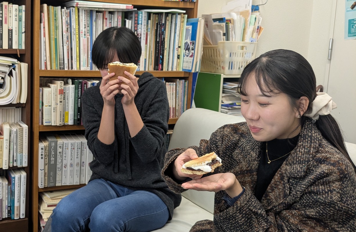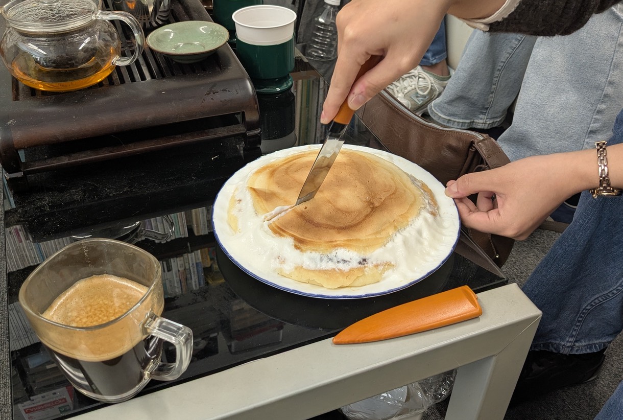 あまりのデカさに驚きつつも、中林さんが慎重に4等分したどら焼きを、クリームが垂れないようにこれまた一切れずつ慎重に取り、全員が口に運んだ。そこで出たのは意外にも「おいしい!」の声。ホットケーキ生地だったので、どら焼きらしくなるか不安だったが、時間がたってしっとりとした生地に仕上がっていたらしい。思った以上に好評だったので、こっちまで嬉しくなった。