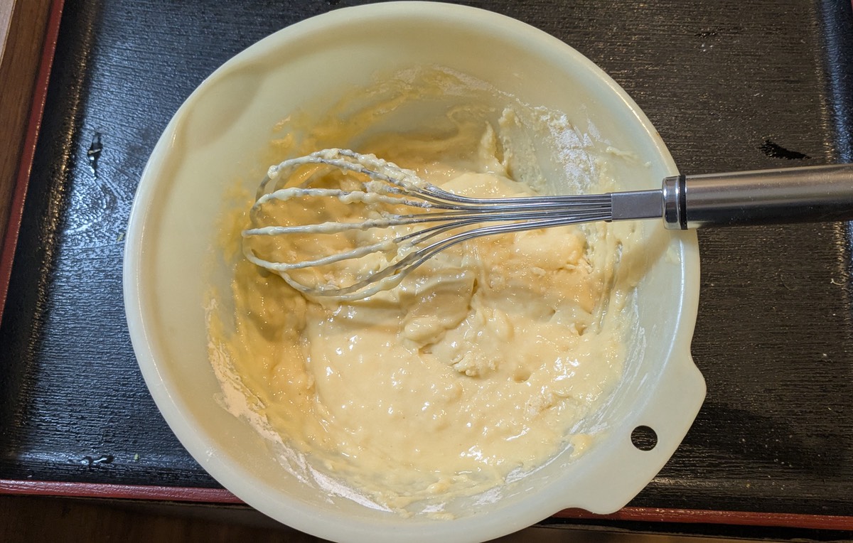 卵・牛乳・ホットケーキミックスを混ぜて…