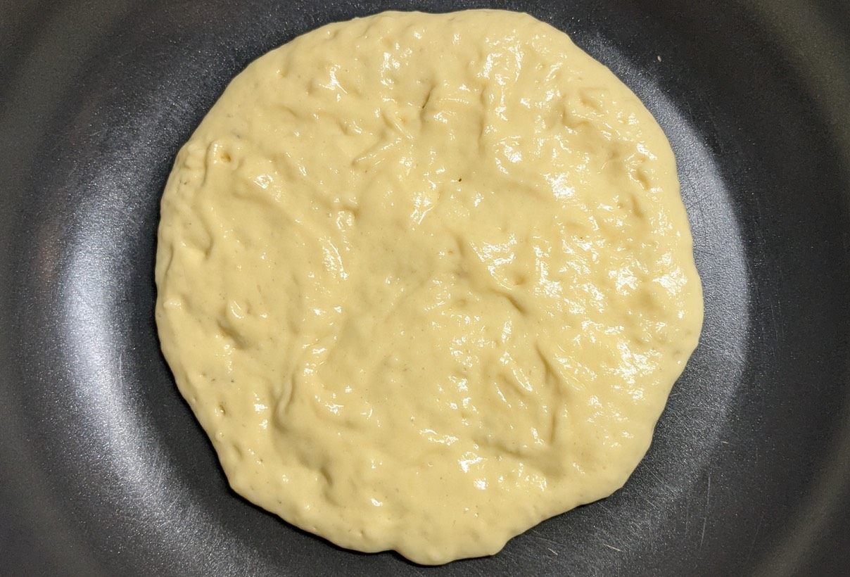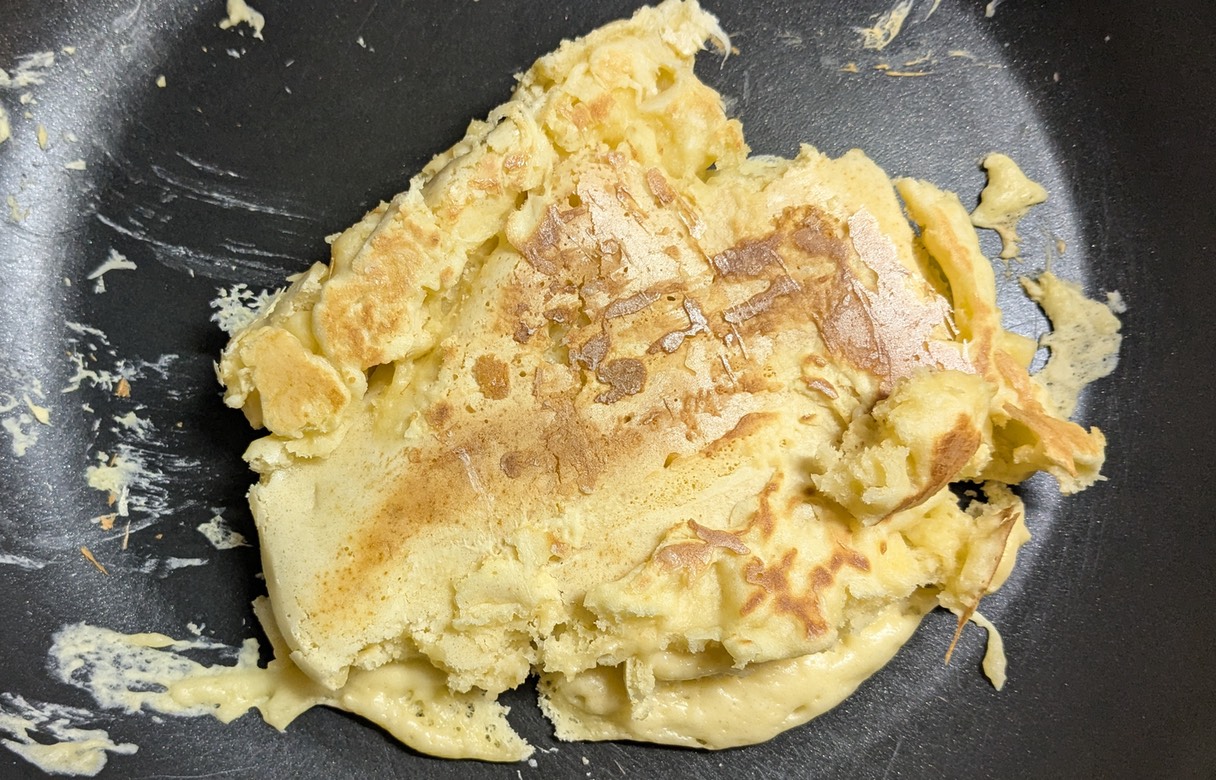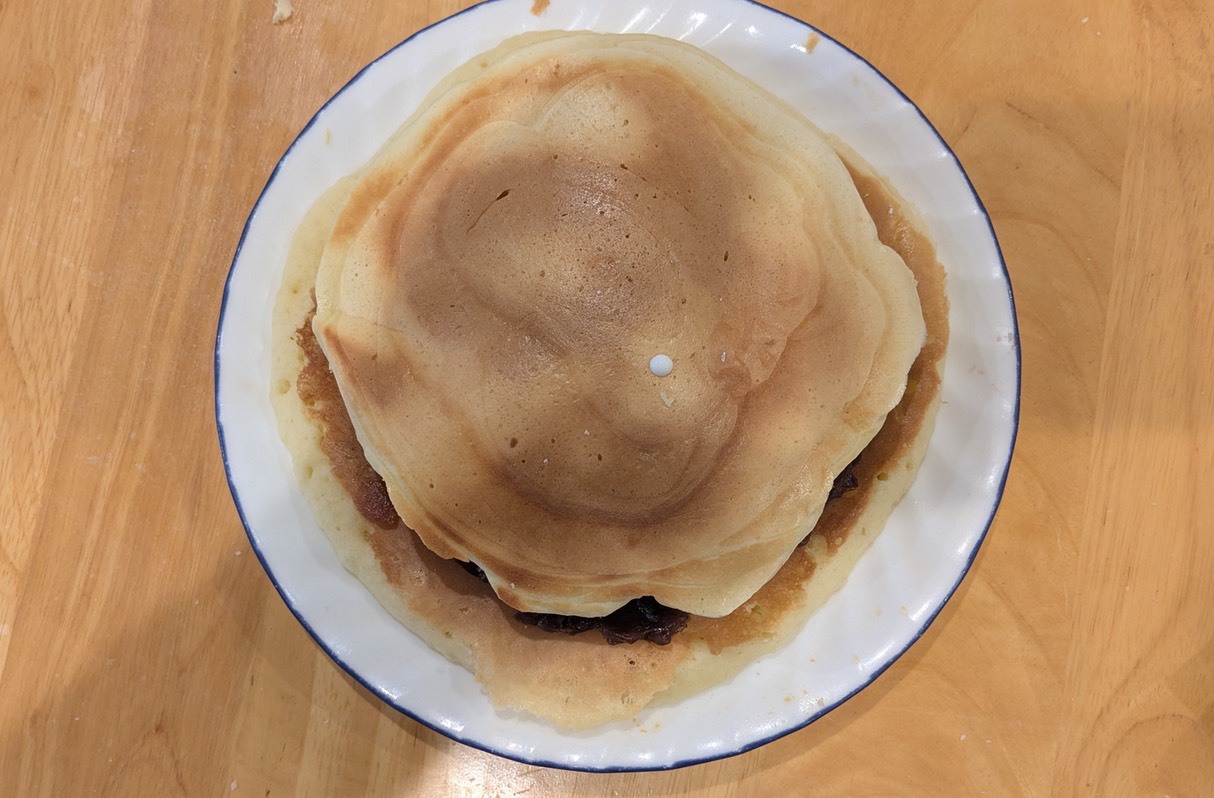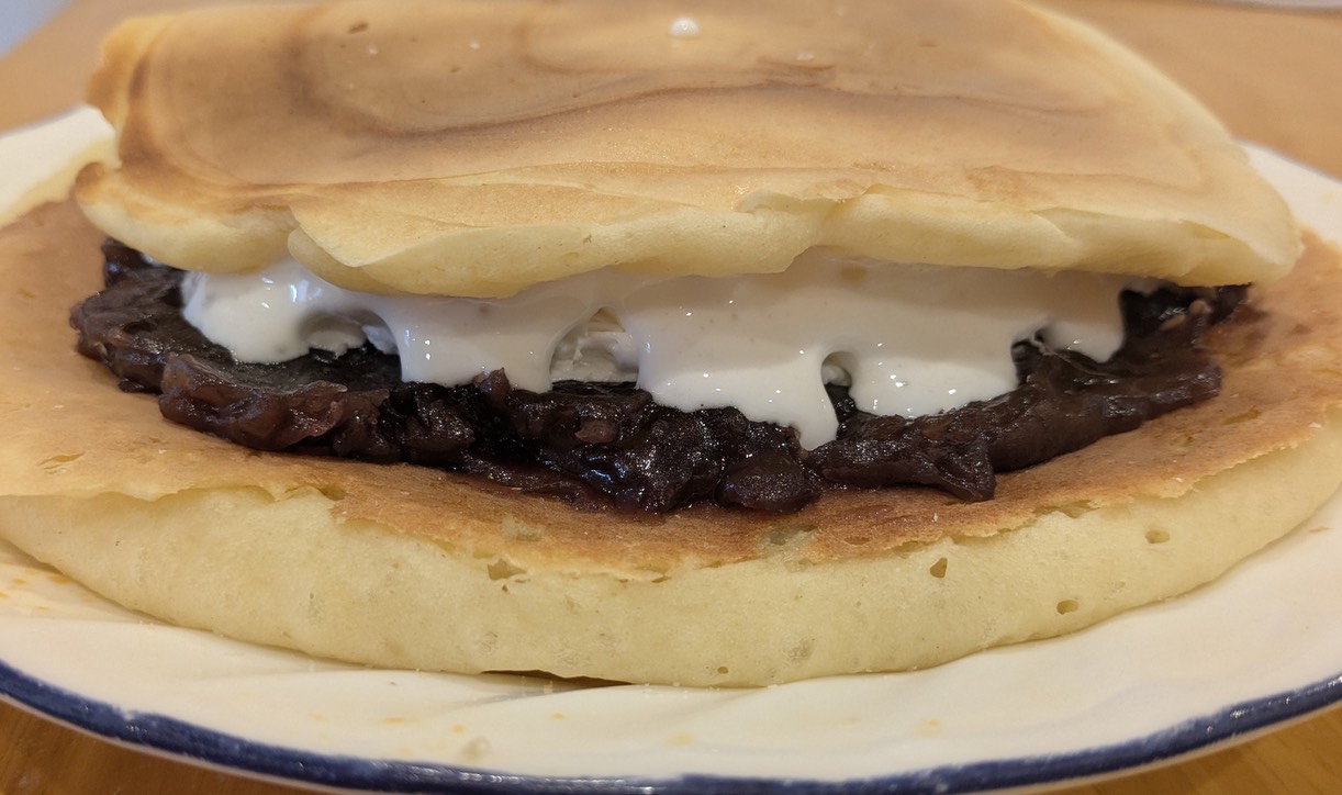 今回のどら焼きは単純なものである。①ホットケーキを2枚作る。②あんことホイップクリームを片方に塗る。③もう一枚のホットケーキを上に乗せる。という手順で作るものである。ホットケーキの生地は、もう少しどら焼きっぽく味を調整することはできるらしいのだが、それは今回は見送ることにした。